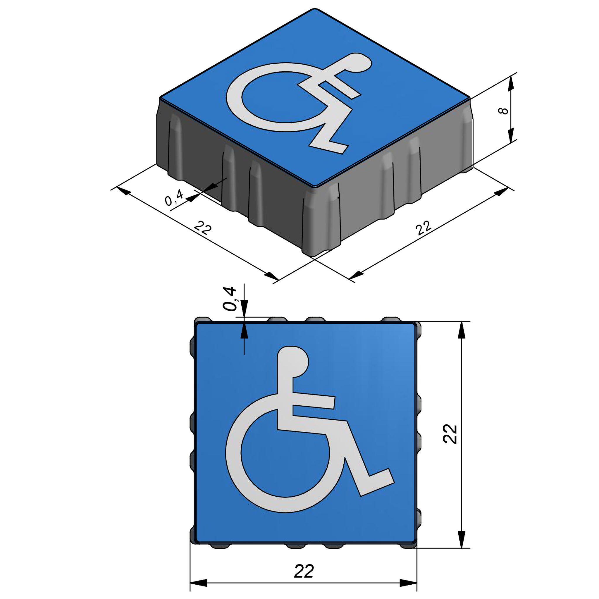 Deze symboolklinker (22x22x8 cm) met aanduiding rolstoel is een niet-waterpasserende klinker die perfect combineerbaar is met het waterpasserende gamma Flex Fusion (22x11, 22x22, 33x11, 44x22 cm). De toplaag van deze parkeerklinker is blauw en contrasteert goed met de omliggende verharding.